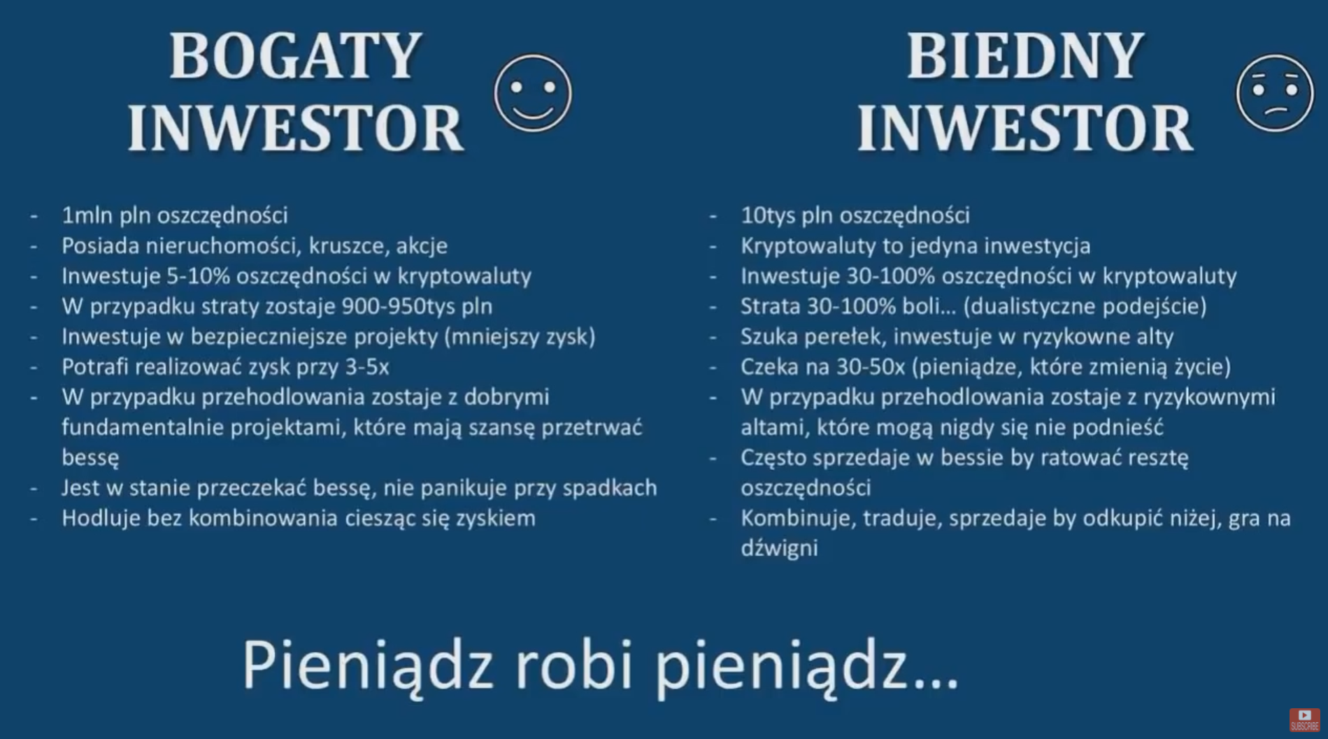 Biorą oni udział w tym samym rynku, ale mają radykalnie inne nastawienie mentalne i podejmują inne decyzje. Błędy biednego inwestora najczęściej sprowadzają się do braku zarządzania ryzykiem, braku dywersyfikacji portfela, wchodzeniu all-in, tzw. dualistyczne podejście do pieniędzy.