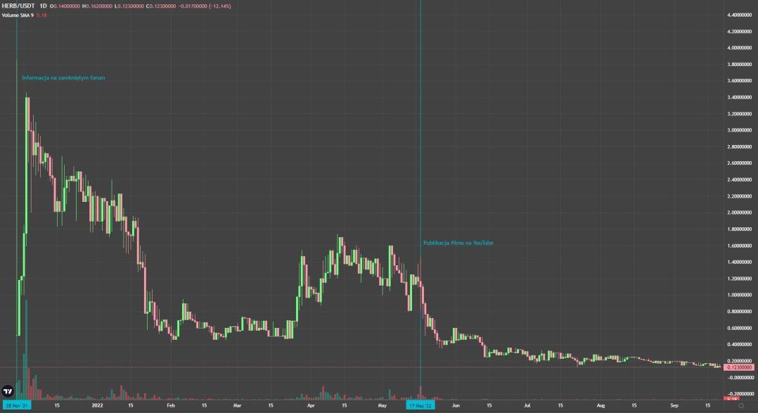 Na poparcie swoich argumentów załączył dwa wykresy tokenów HERB i BTEC. Oznaczył na nich, kiedy Phil Konieczny informował o projekcie na zamkniętym forum, a kiedy pojawił się film na YouTube.