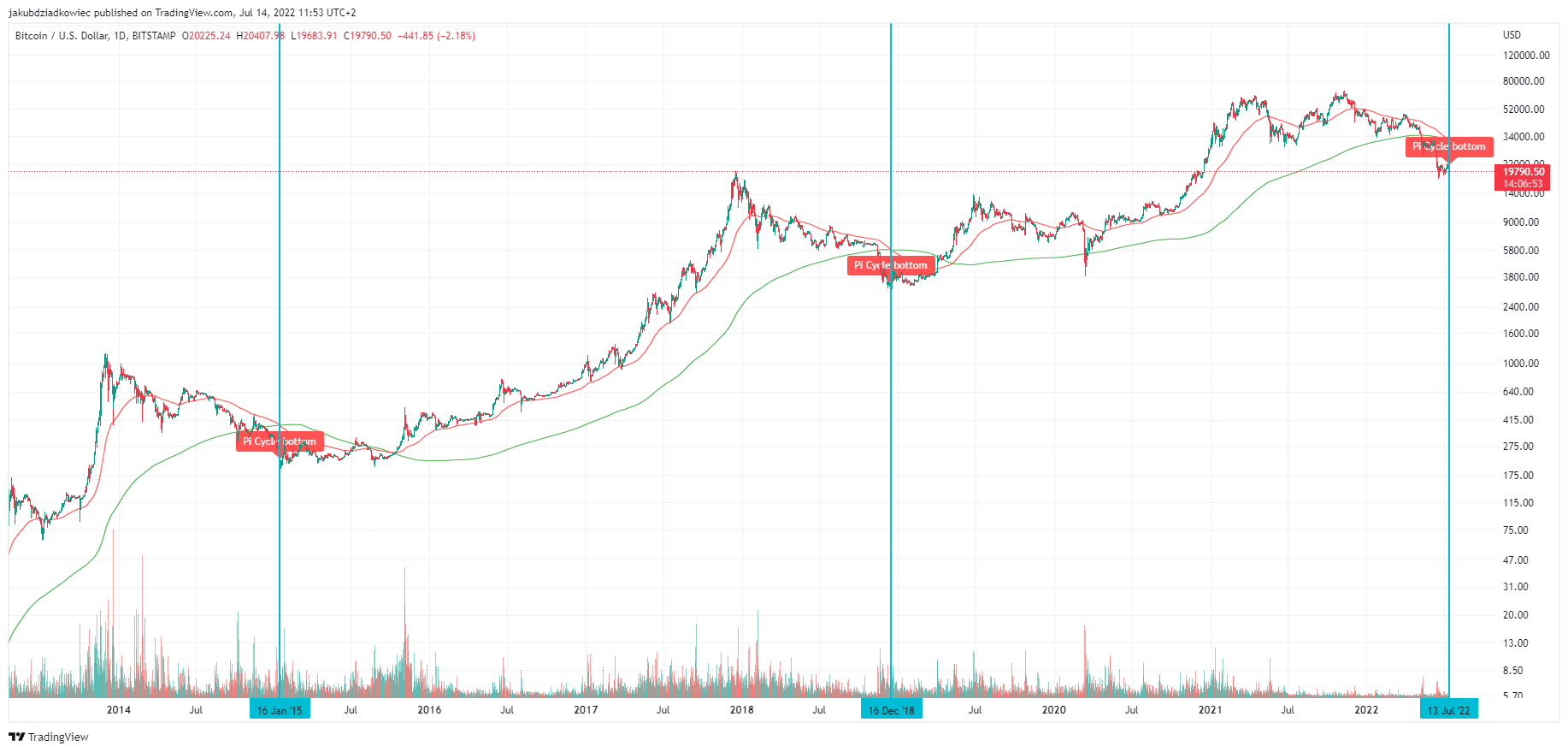 Pod koniec zeszłego miesiąca BeInCrypto przedstawiło analizę, według której wskaźnik Pi Cycle Bottom miał zapalić się w dniu 9 lipca. Stało się to jednak wczoraj, w dniu 13 lipca, gdy BTC spadła do poziomu 18 900 USD.