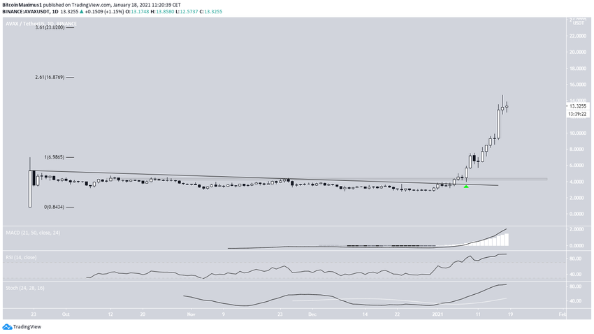 AVAX gwałtownie wzrastał od momentu wybicia się z opadającej linii oporu i odzyskania poziomu z dnia 8 stycznia. Od tego czasu tempo wzrostu stało się paraboliczne.