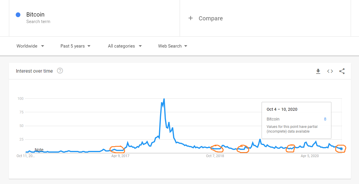 Aktualna sytuacja jest radykalnie inna. Na poniższych wykresach zaznaczone bowiem zostały okresy, w których zainteresowanie frazą „Bitcoin” było rekordowo niskie i sięgało okolic 7-8 punktów (na pomarańczowo). Co ciekawe, również dla poprzedniego tygodnia 4-10 października 2020 roku Google Trends pokazuje wartość 8.