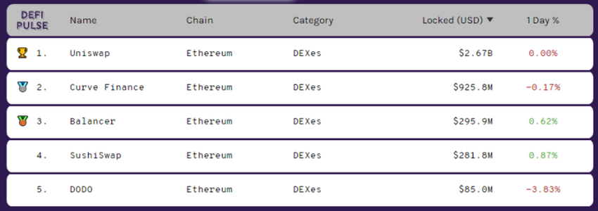 Według DeFi Pulse jest to zdecydowanie najpopularniejszy w użyciu DEX, z zablokowaną wartością 2,6 miliarda dolarów. Statystyki z Dune Analytics pokazują również, że miesięczny obrót dla Uniswap wyniósł 15,3 miliarda dolarów w październiku – więcej niż to, co Coinbase zanotowało w tym samym miesiącu. Uniswap ma również największą liczbę użytkowników – ponad 428 000.