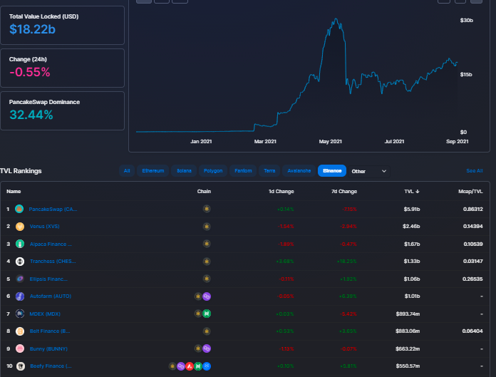 Szybki rozwój BSC doprowadził do parabolicznego wzrostu nowych projektów DeFi – nie tylko zwycięzców MVB. Poszczególne protokoły, takie jak PCS, BeefyFinance, AutoFarm, BakerySwap, Venus, Alpaca Finance, MDEX i Nerve szybciutko zyskały ogromną popularnoś. Warto zwrócić uwagę na PancakeSwap, który zdominował aż 34% całego TVL Binance Smart Chaina.