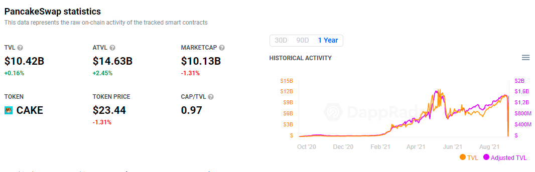 PCS odnotowuje ten sam dynamiczny wzrost, co TVL sieci. Na początku 2021 roku, w protokole było zablokowane 150 mln wartości. Od tego czasu jednak liczba ta zwiększyła się o ponad 800%, osiągając szczyt na poziomie 1,29 mld USD.