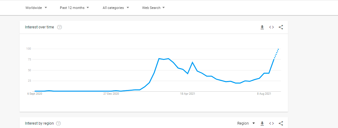 SponsoredNie był to tylko trend na sieci Binance, ale również wszystkich innych blockchainów – program MVB II tylko przyspieszył rozwój na BSC. Axie Infinity stało się największym protokołem we wszystkich DeFi, odnotowując ponad 1 miliard w wolumenie i 200 milionów w przychodach. Patrząc na Google Trends, wydaje się, że NFT nie trafiły jeszcze nawet do głównego nurtu – wciąż są poniżej wcześniejszego rekordu wyszukiwań.