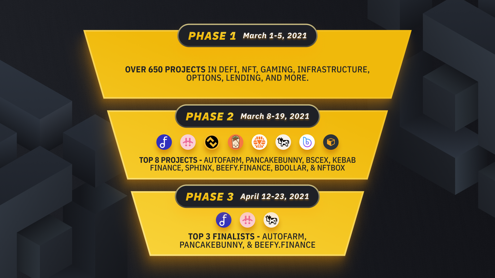 Do trzeciego etapu przeszły projekty Beefy, AutoFarm, i PancakeBunny. AutoFarm i Beefy znalazły się w strefie innowacji Binance, podczas gdy PancakeBunny otrzymał 1,6 mln USD inwestycji w rundzie zalążkowej od Binance Labs.