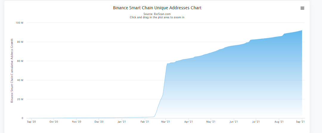 BSC zapewniło skalowalne rozwiązanie DeFi dla ponad 90 000 000 użytkowników dzięki wsparciu ekosystemu w wysokości 100 mln dolarów. Dzięki skalowalności i społeczności, Binance Smart Chain zdobył 32% całkowitej zablokowanej wartości (TVL) DeFi w ciągu roku od swojej premiery.