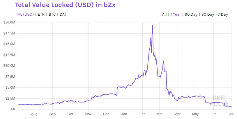 Przed cyfrowym wtargnięciem, bZx był na szczycie uderzając w ATH pod względem całkowitej wartości zablokowanej w połowie lutego. Było to prawie 20 milionów dolarów. Od tego czasu, zabezpieczenie w krypto spadło na platformie z TVL o 96% do obecnego poziomu, który wynosi około 720k dolarów.