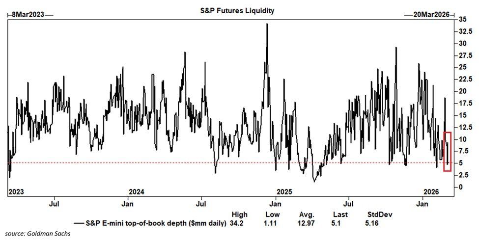 „Płynność rynku gwałtownie spada w związku z wojną w Iranie: Płynność kontraktów terminowych na indeks S&P 500 spadła do zaledwie 5,1 mln USD, co jest wartością zbliżoną do najniższej od kwietnia 2025 r., czyli ‘Dnia Wyzwolenia’. Głębokość portfela inwestycyjnego spadła o 80% od początku roku i jest obecnie o 61% niższa od średniej historycznej wynoszącej ~13 mln USD.”