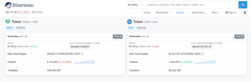 USD Coin (USDC) prześcignął Tether (USDT) w całkowitej podaży na blockchainie Ethereum. Całkowita podaż USDC wynosi 40,3 miliarda dolarów, podczas gdy całkowita podaż USDT na Ethereum wynosi 39,8 miliarda dolarów. W przeciwieństwie do USDT, większość podaży USDC jest obecna na blockchainie Ethereum.