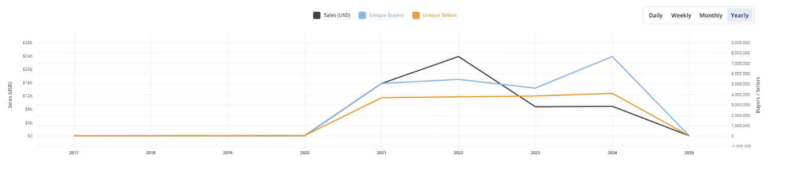Rok 2024 przyniósł znaczące trudności na rynku NFT, w tym siedmiomiesięczny spadek sprzedaży. We wrześniu odnotowano najniższe wolumeny sprzedaży od 2021 roku, co odzwierciedlało zmniejszone zainteresowanie spekulacyjne i przesycenie rynku.