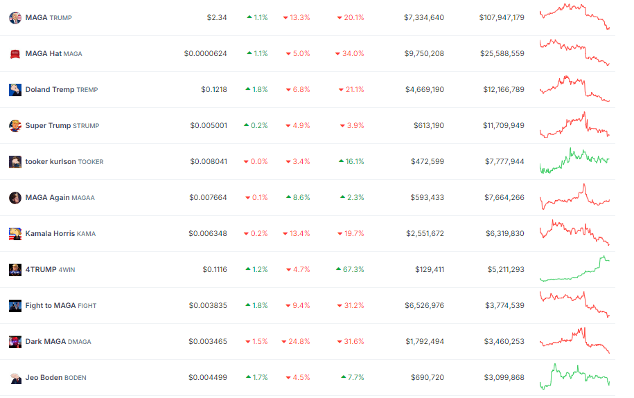 Pięć najpopularniejszych memecoinów PolitiFi — MAGA (TRUMP), MAGA Hat (MAGA), Doland Tremp (TREMP), Jeo Boden (BODEN) i Kamala Horris (KAMA) — teraz znajduje się prawie 90% poniżej swojej szczytowej łącznej kapitalizacji rynkowej.