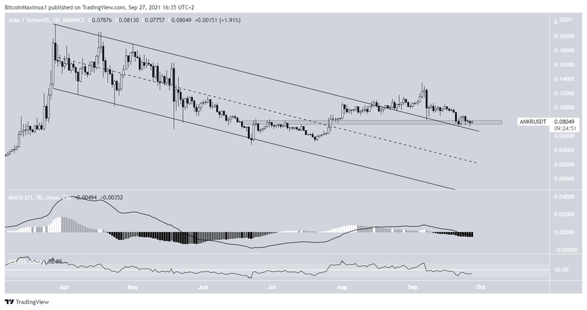 ANKR jest notowany wewnątrz długoterminowego opadającego kanału równoległego od czasu osiągnięcia ATH na 0,216 USD w dniu 28 marca. Doprowadziło to do dołka na poziomie 0,047 USD w dniu 22 czerwca.