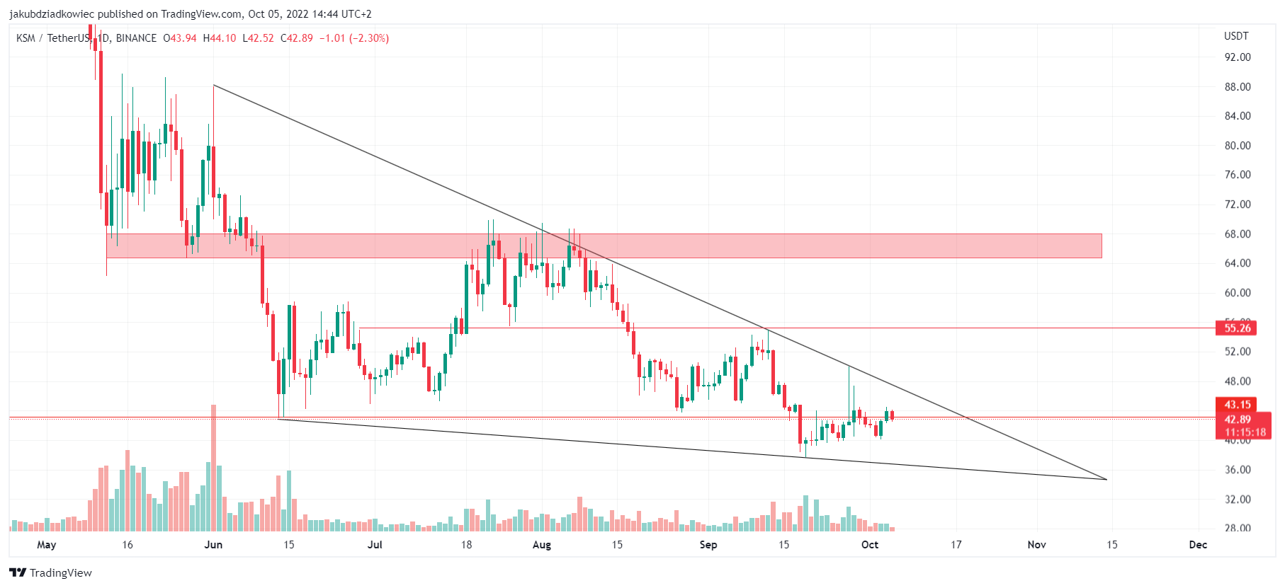 Akcja cenowa KSM, tokena sieci Kusama, wygląda podobnie do wykresu DOT. Różnica jednak polega na tym, że tutaj kurs spadł już poniżej długoterminowego wsparcia na poziomie 43,15 USD. Poza tym cena porusza się we wzorcu zniżkującego klina.
