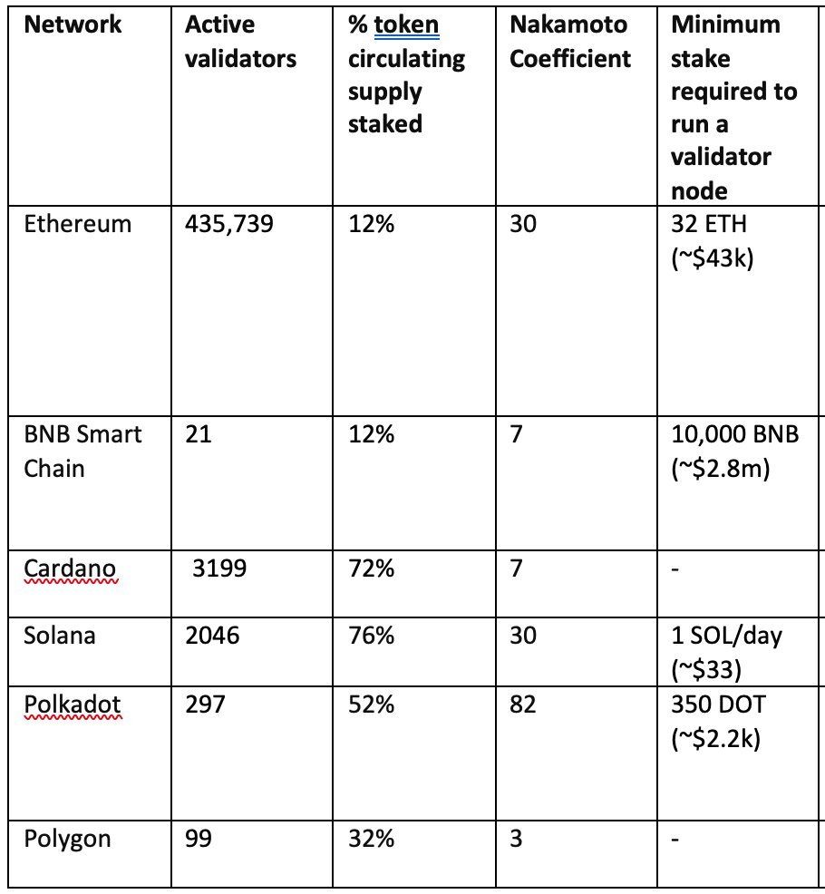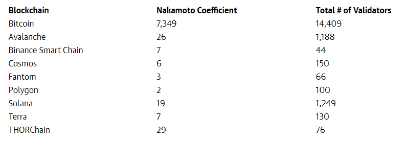 Tak wysoka wartość współczynnika jest możliwa dzięki stosunkowo niewielkiej liczbie walidatorów połączonej z relatywnie wysokim bezpieczeństwem sieci. Wśród największych blockchainów jedynie Bitcoin (BTC) posiada wyższy współczynnik Nakamoto, który wynosi aż 7349.