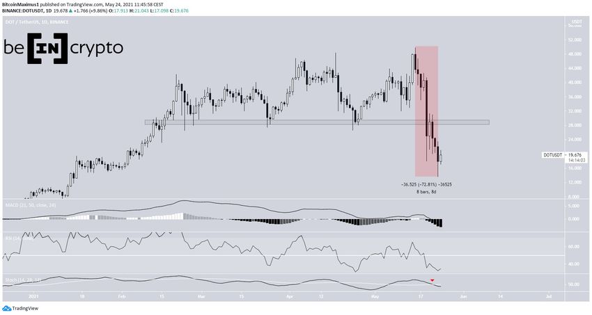 Kurs Polkadot (DOT) spada od dnia 15 maja, kiedy osiągnął nowy rekord wszech czasów (ATH) na poziomie 49,78 USD.