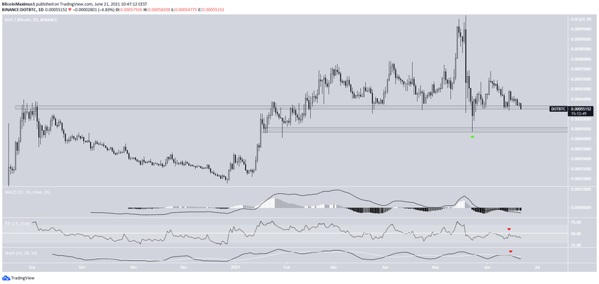 Podobnie jak jego odpowiednik w USD, DOT/BTC próbuje utrzymać się powyżej poziomu wsparcia na 56 000 satoshi.