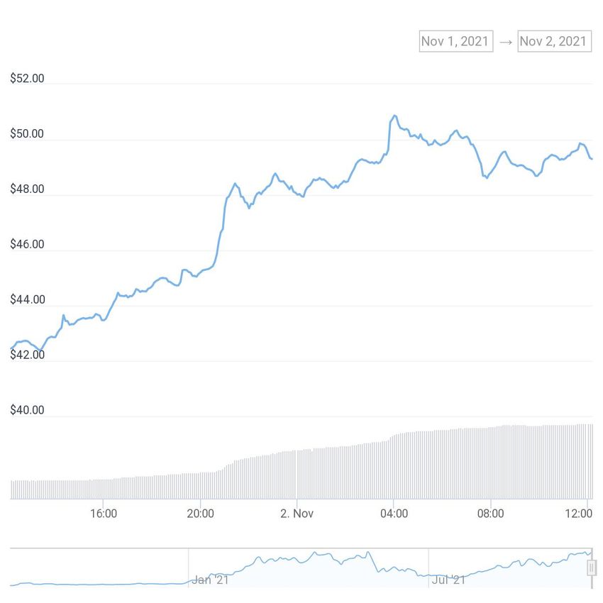 Impuls ten doprowadził ceny DOT do nowego rekordu wszechczasów 50,87 USD podczas późnego handlu 1 listopada. W momencie publikacji DOT wycofał się nieznacznie do poziomu 49,84 USD, ale jego wartość wzrosła o imponujące 17% w ciągu dnia.