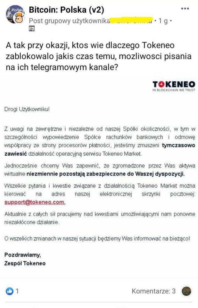 W piątek polska giełda Tokeneo wysłała emaile do swoich użytkowników informujące, że platforma tymczasowo zawiesza działalność. Jako przyczynę podano problemy zewnętrzne – wypowiedzenie kont bankowych oraz odmowa współpracy ze strony procesorów płatności. We wczorajszym live streamie, który miał rozwiać wątpliwości klientów CEO giełdy – Tomasz Rozmus ogłosił, że platforma jest wystawiona na sprzedaż za 2,5 mln PLN.