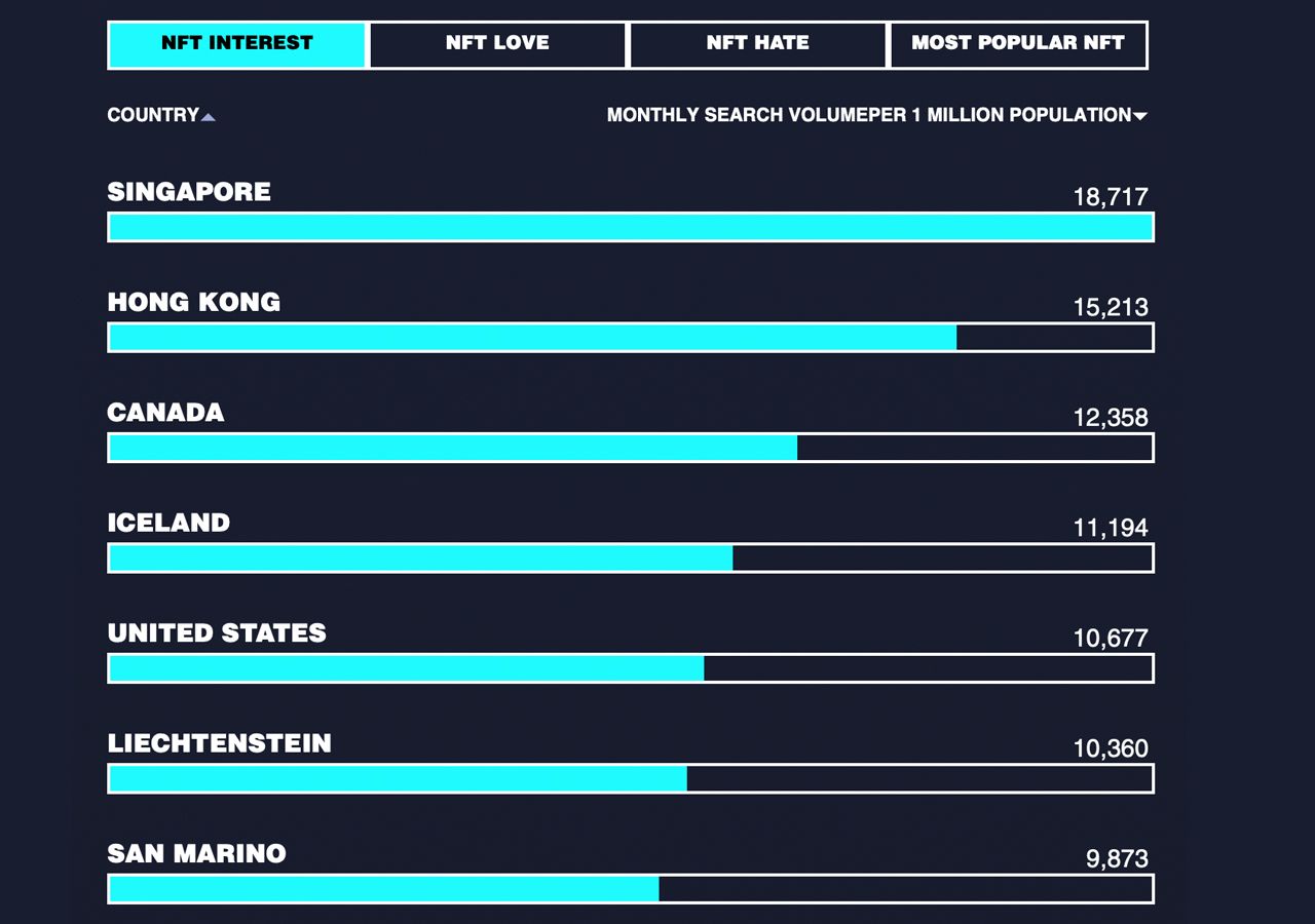 SponsoredSingapur wyszukuje NFT bardziej niż jakikolwiek inny kraj. Z 18 717 wyszukiwaniami na milion mieszkańców miesięcznie.