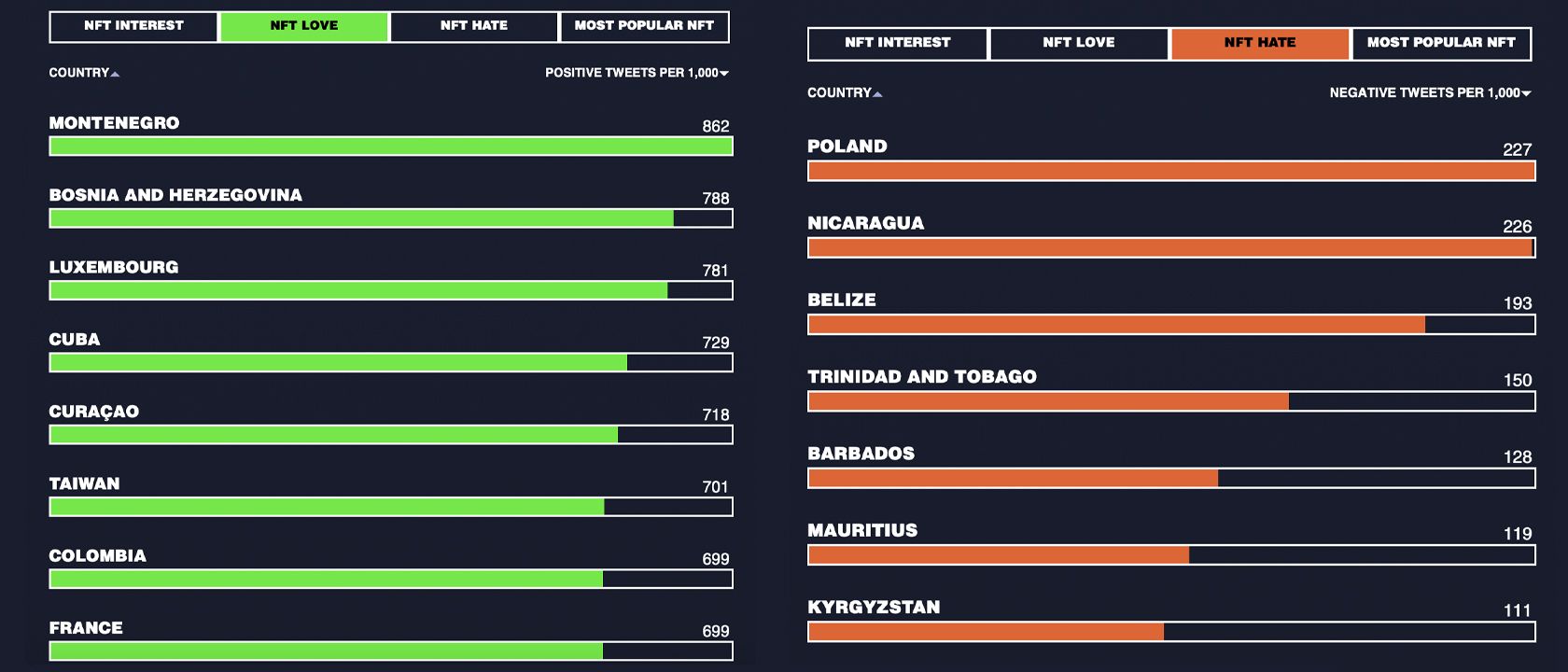 Accoring to Twitter data, Poland is the most anti-NFT country, with 227 of every 1,000 NFT-themed tweets being negative in sentiment.