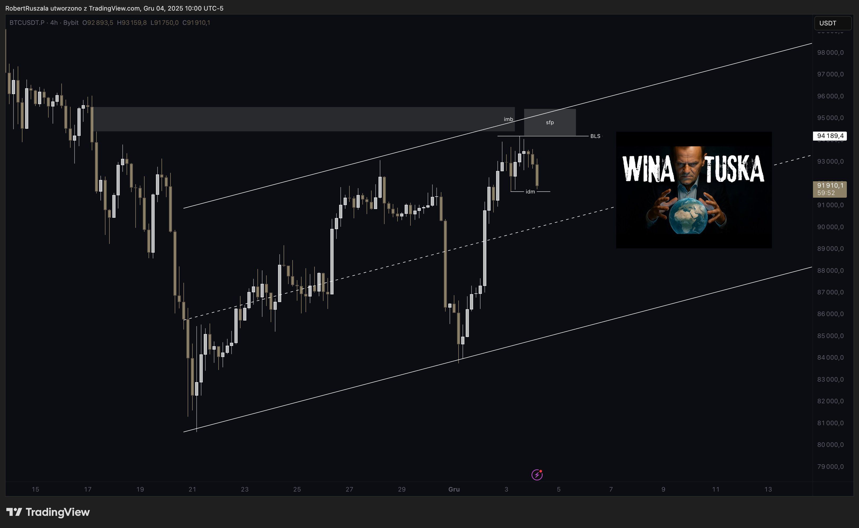 Kilka godzin przed właściwym ruchem ceny na Bitcoinie, polski trader opublikował komentarz pokazujący proces podejmowania decyzji w czasie rzeczywistym. Ironizował, że niewypełnienie pozycji „to wina Tuska”, odnosząc się do zachowania rynku. Cena nie weszła jednak wystarczająco wysoko, aby mógł szukać idealnego wejścia w shorta. El Profesor napisał: