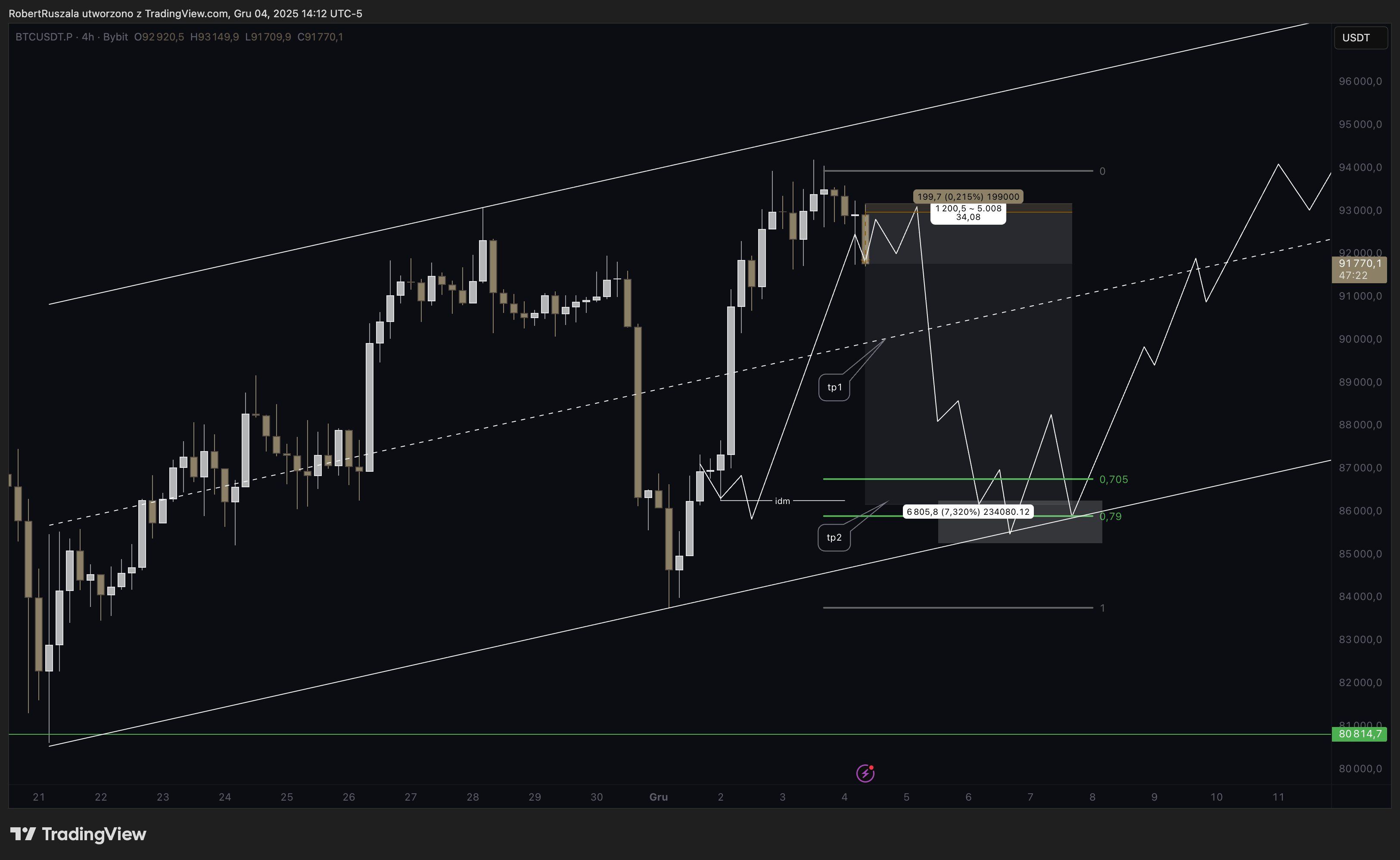 Jak tłumaczy polski trader, jego pierwszym celem jest TP1, czyli Take Profit 1. To poziom pierwszej realizacji zysków. W tym przypadku znajduje się w połowie kanału, który jest przedzielony linią przerywaną widoczną na wykresie. Drugim celem jest TP2, czyli końcowy poziom realizacji pozycji.