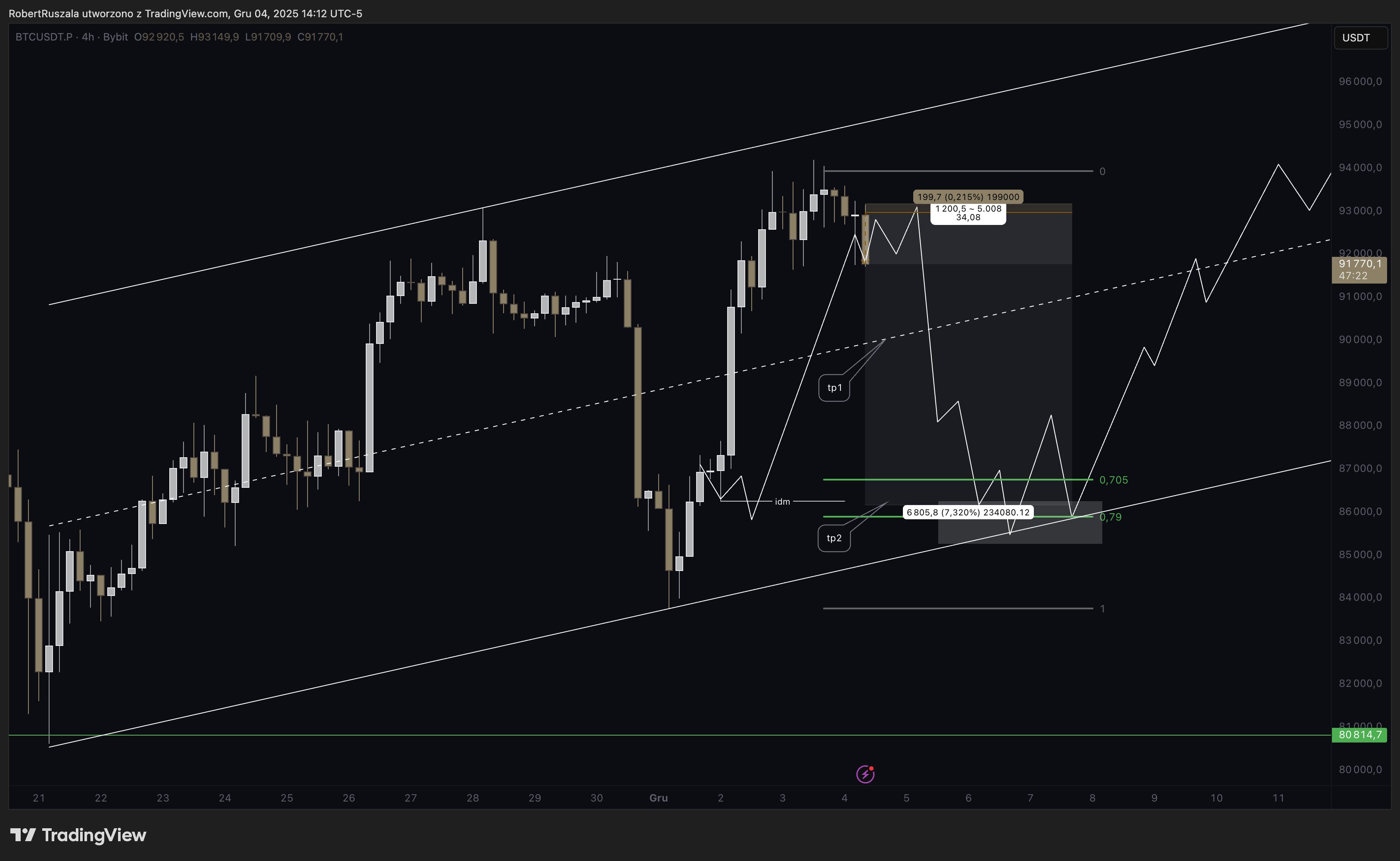 „Podchodziłem do short-a 3x – partials po drodze, później BE, aż się udało na sesji NY (już zabezpieczona). Tp1 – połowa kanału. Tp2 – OTE. W OTE będę szukał swing longa pod, moim zdaniem, ostatnią nogę up kończącą fale C.”
