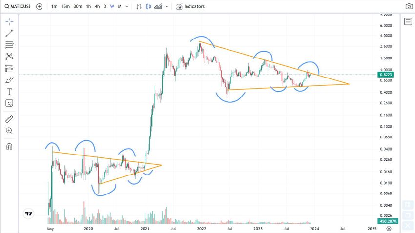 Ciemnozielony tweetował o długoterminowym trójkącie symetrycznym. Zasugerował on, że ruch będzie podobny do tego z 2021 r., kiedy to MATIC przyspieszył wzrost po wybiciu z podobnej formacji.