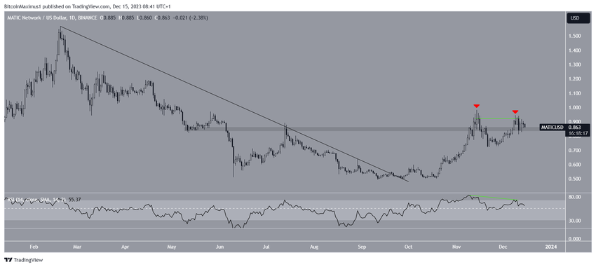 Analiza techniczna dziennego przedziału czasowego pokazuje, że cena MATIC wzrosła od października, kiedy to wybił się on z opadającej linii trendu oporu. Ruch w górę doprowadził do szczytu na poziomie 0,98 USD w dniu 14 listopada.