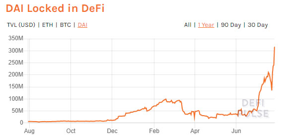 Wygląda na to, że Dai wpływał do DeFi przez ostatnie cztery dni, odkąd TVL na wszystkich platformach wzrósł o 135% i według DeFi Pulse osiągnął najwyższy w historii poziom 316 milionów.