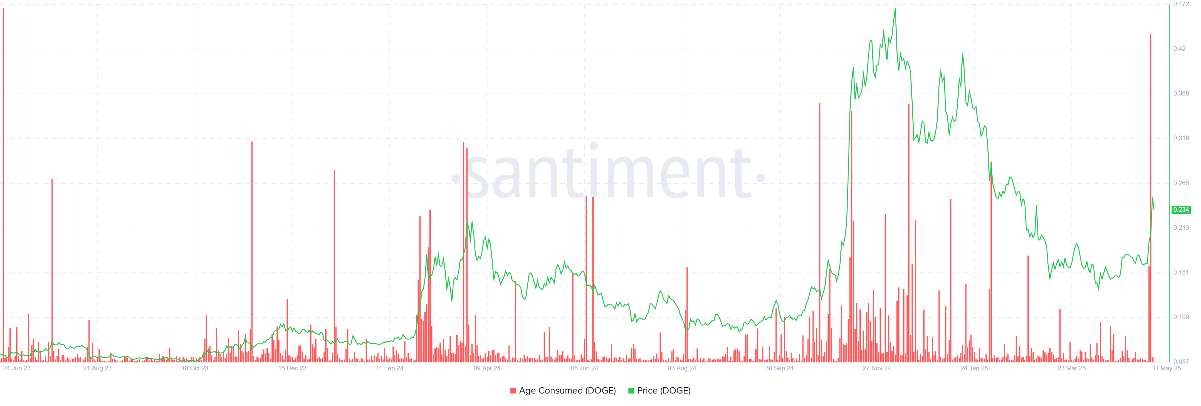Wskaźnik Age Consumed dla Dogecoin wykazał gwałtowny wzrost, sygnalizując, że LTH sprzedają swoje udziały w tempie niespotykanym od czerwca 2023 roku. Ten wzrost aktywności sprzedażowej oznacza najcięższą sprzedaż od prawie dwóch lat, co podkreśla zmianę w zachowaniu inwestorów.