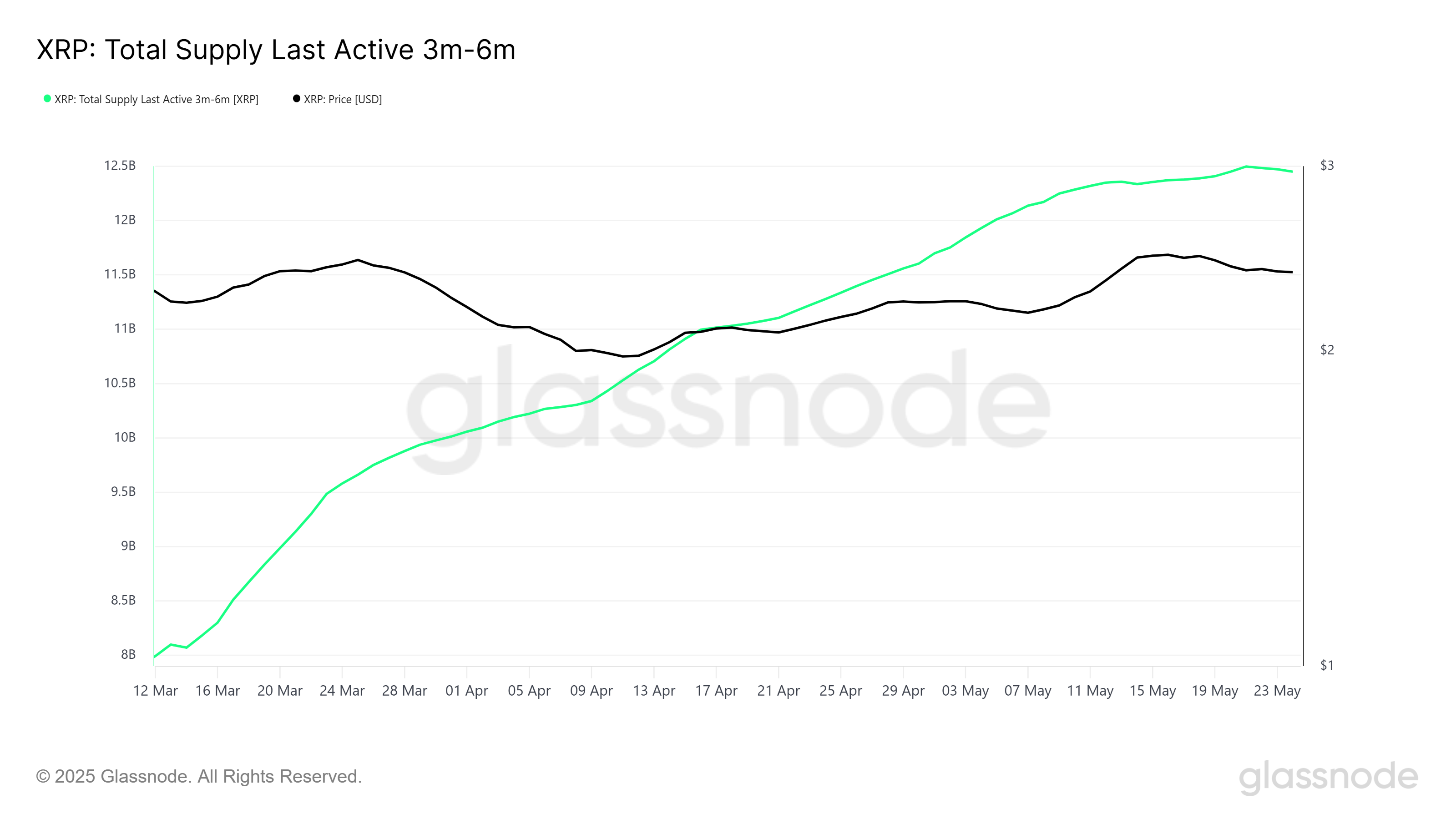 W przeciwieństwie do słabnącej korelacji z Bitcoinem, zachowanie inwestorów XRP wykazuje bardziej stabilny trend. Całkowita podaż XRP, która pozostaje nietknięta przez 3-6 miesięcy, stale rośnie w tym miesiącu.