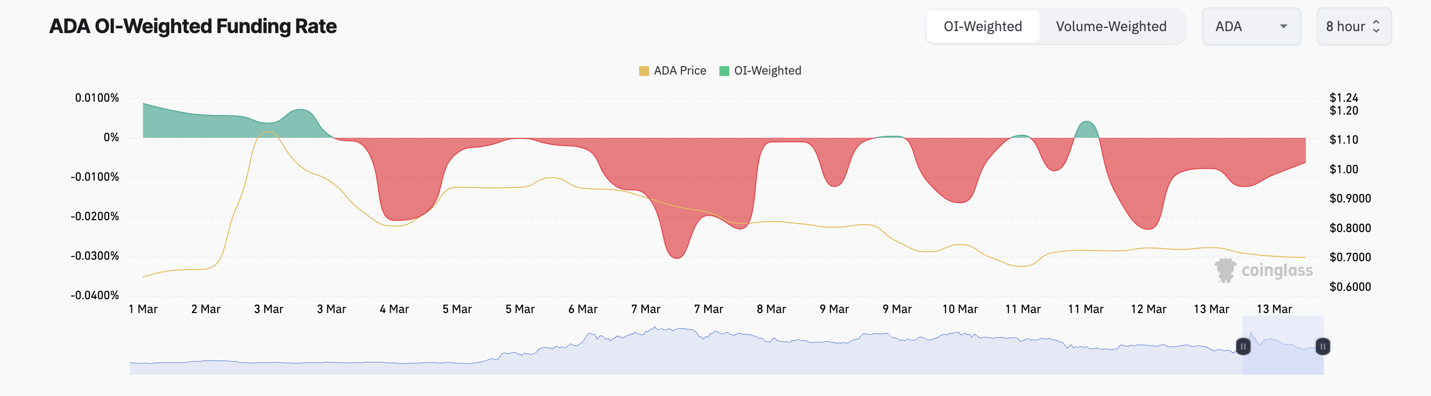 Dodatkowo stopa finansowania ADA na rynku instrumentów pochodnych pozostaje ujemna, co potwierdza niedźwiedzią tendencję wobec niej. Według Coinglass obecnie wynosi ona -0,006%.