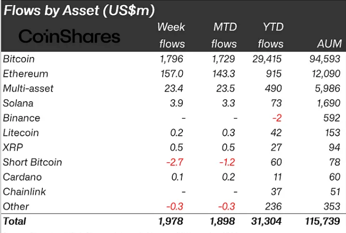 Powyborcze szaleństwo doprowadziło do rekordowych inwestycji na rynku kryptowalut na poziomie 1,98 mld USD. Rynki pozostają w stanie euforii po zwycięstwie Donalda Trumpa. Oznacza to pięciotygodniową serię napływów, podnosząc sumę od początku roku (YTD) do rekordowych 31,3 mld USD.