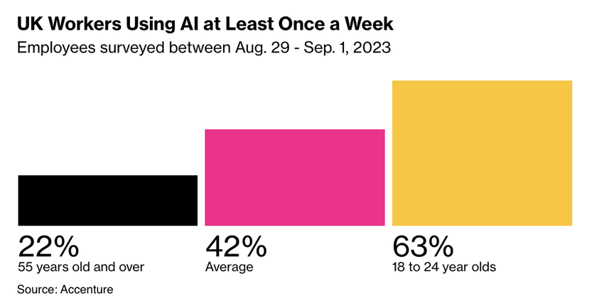 Raport Bloomberga, powołujący się na ankietę Accenture, wspomina, że połowa brytyjskich pracowników korzysta z generatywnej AI przynajmniej raz w tygodniu. Firma Accenture przeprowadziła ankietę wśród 2002 pracowników z Wielkiej Brytanii pracujących zarówno na miejscu, jak i zdalnie.