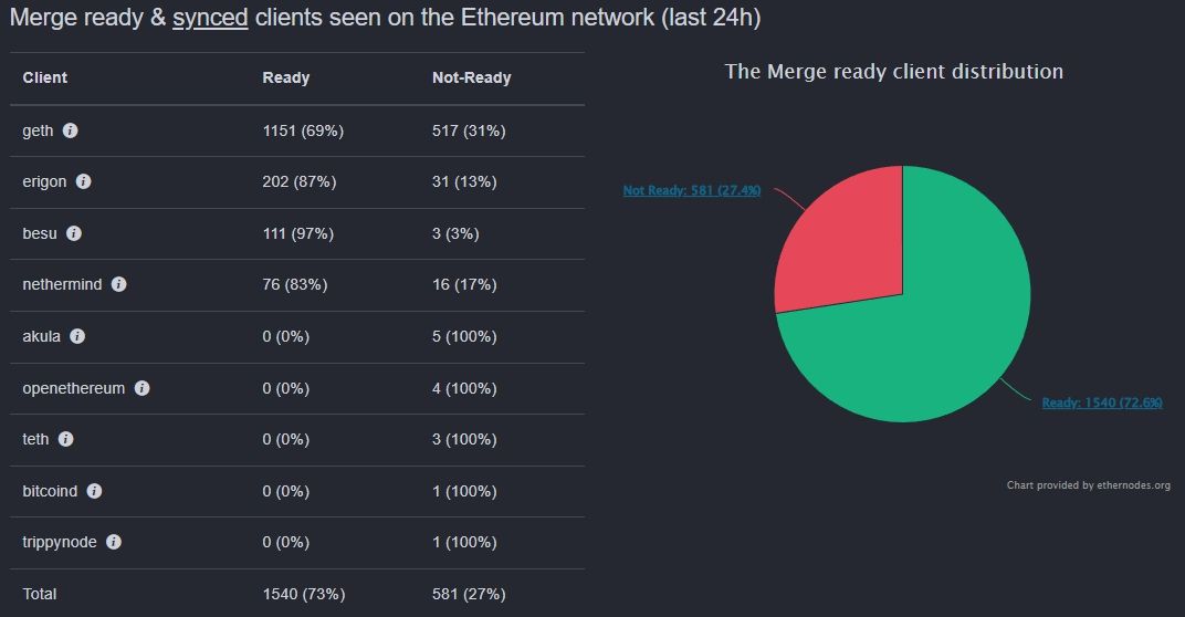 72,6% węzłów Ethereum jest gotowych do The Merge przed planowaną na 6 września aktualizacją Bellatrix. Tak wynika z informacji Ethernodes.