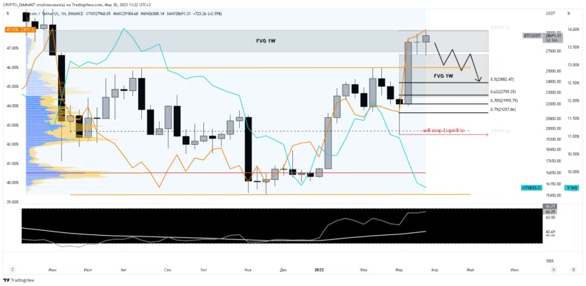 W związku z tym prognoza Bitcoina na kwiecień 2023 roku od Denisa Trapezenko nie wyklucza powolnej korekty obecnego wzrostu do wartości 0,5 siatki zniesienia Fibonacciego (23 800 USD).
