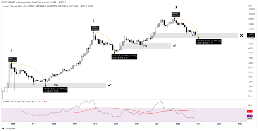 “W skrajnym cyklu numer “3”, w którym się znajdujemy, występuje szereg niewypełnionych nierówności. Zakończeniem fazy spadkowej będzie nałożenie się tych luk cenowych i test strefy wsparcia (10 000-12 000 USD). Tym samym w grudniu możemy spodziewać się dalszej 20%-30% deprecjacji BTC. Po osiągnięciu tych stref, uczestnicy instytucjonalni prawdopodobnie zaczną akumulować swoje pozycje w BTC”.