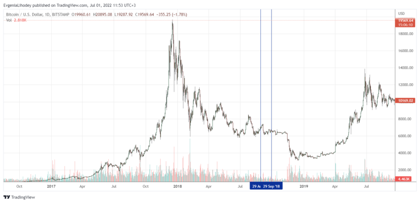 Aby zrozumieć, jaki dla Bitcoina może być lipiec 2022 roku, musimy określić, w jakiej fazie, względem halvingu, znajduje się BTC. Będzie to wymagało przeanalizowania zachowania kryptowaluty w podobnym przedziale czasowym po wcześniejszym zmniejszeniu o połowę prędkości wydobycia monety.