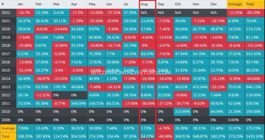 Sierpień tradycyjnie nie jest dobrym miesiącem dla Bitcoina, co pokazuje historia. W ciągu ostatnich 11 lat kryptowaluta wykazała negatywny trend w 6 przypadkach podczas tej ramy czasowej. Oto jak wyglądają statystyki w ujęciu procentowym: