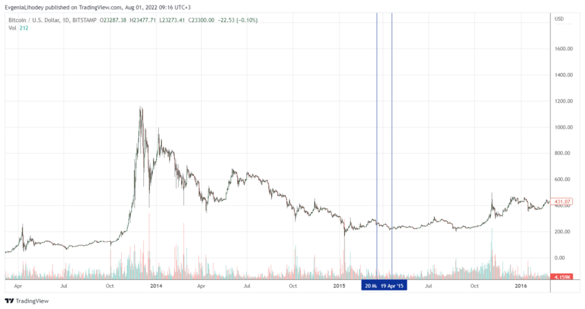 W okresie od 20 marca 2015 r. do 19 kwietnia 2015 r. kryptowaluta znajdowała się w trendzie bocznym. Tym samym Bitcoin zakończył ten okres czasu poniżej kursu zanotowanego na jego początku