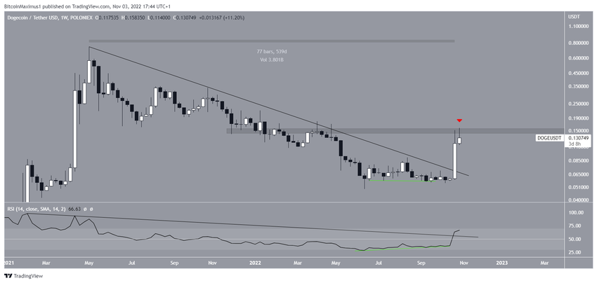 Kurs Dogecoin osiągnął szczyt na poziomie 0,158 USD, zanim odrzucił go obszar oporu na 0,15 USD (czerwona ikona).
