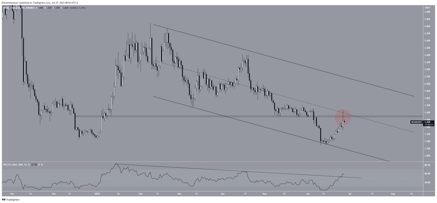 Pomimo znacznego wzrostu od rocznego dołka, cena zmaga się z konfluencją poziomów oporu w obszarze 1,55 USD. Horyzontalny obszar oporu 1,55 USD i środek opadającego równoległego kanału (czerwony okrąg) tworzą opór.