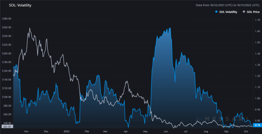 Tymczasem wskaźnik Chaikin Money Flow (CFM) z trudem wybił się z horyzontalnego oporu. Sugeruje to, że napływy na giełdy były kontynuowane pomimo większego niedźwiedziego sentymentu. Jednak z perspektywy cenowej, napływy nie mogły zbytnio pomóc w zwiększeniu momentum, ponieważ zmienność Solana wciąż była na minusie.