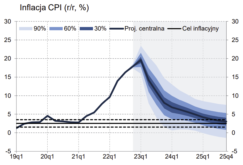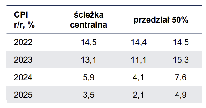 Narodowy Bank Polski (NBP) opublikował raport dotyczący prognozy inflacji i wzrostu gospodarczego w Polsce do 2025 roku. Średnia inflacja konsumencka ma wynieść w przyszłym roku 13,1%, natomiast dopiero za 3 lata ma ustabilizować się w okolicach 3,5%. Natomiast PKB w 2023 roku ma się kształtować na niskim poziomie 0,7%.