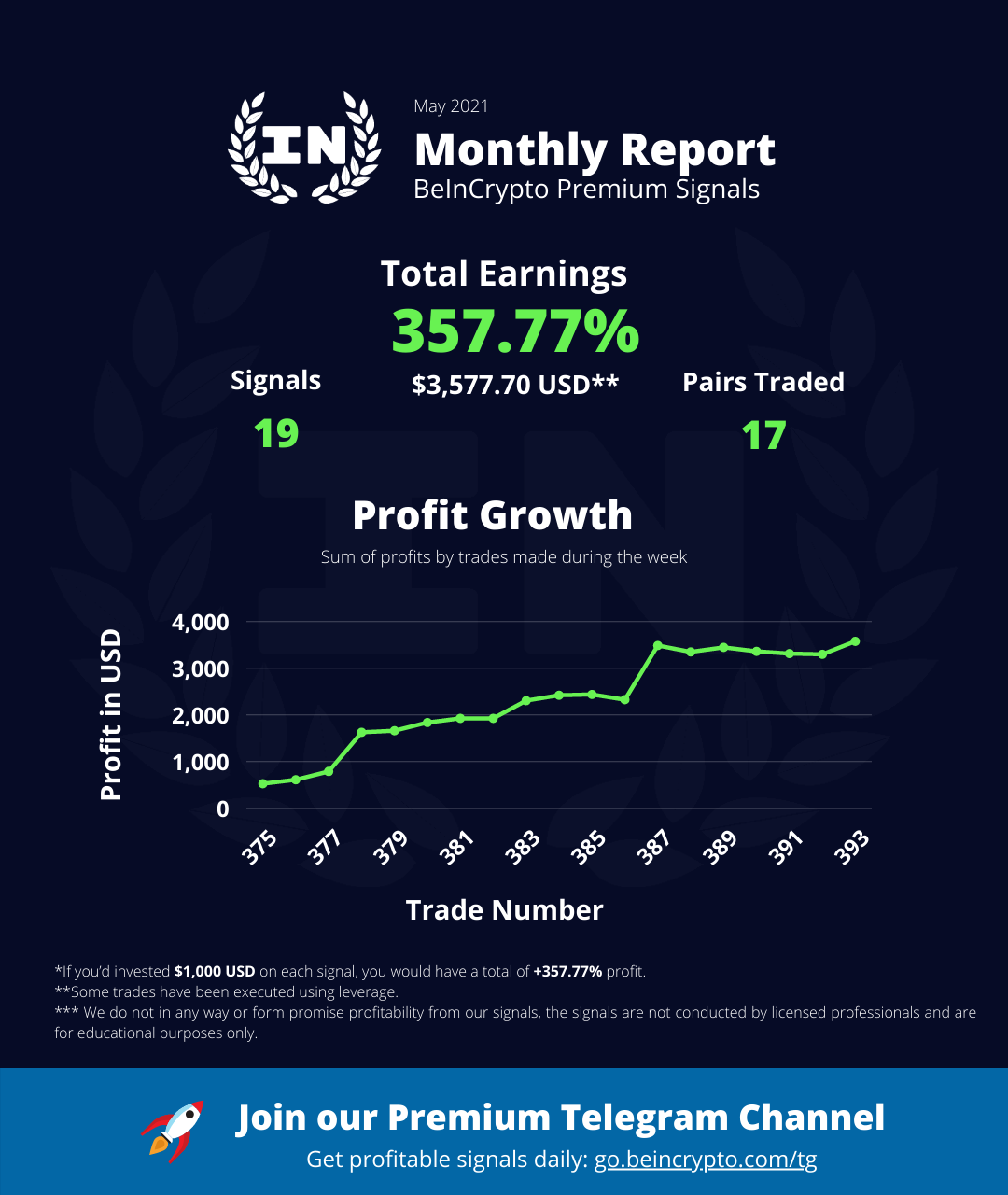 Wystarczy wspomnieć, że z miesiąca na miesiąc nasza społeczność traderska odnotowuje zyski. W niedawnym raporcie za miesiąc maj 2021 wskazaliśmy dokładnie w jaki sposób nasi użytkownicy odnotowali 358% zysku w oparciu o zaledwie 19 sygnałów tradingowych.