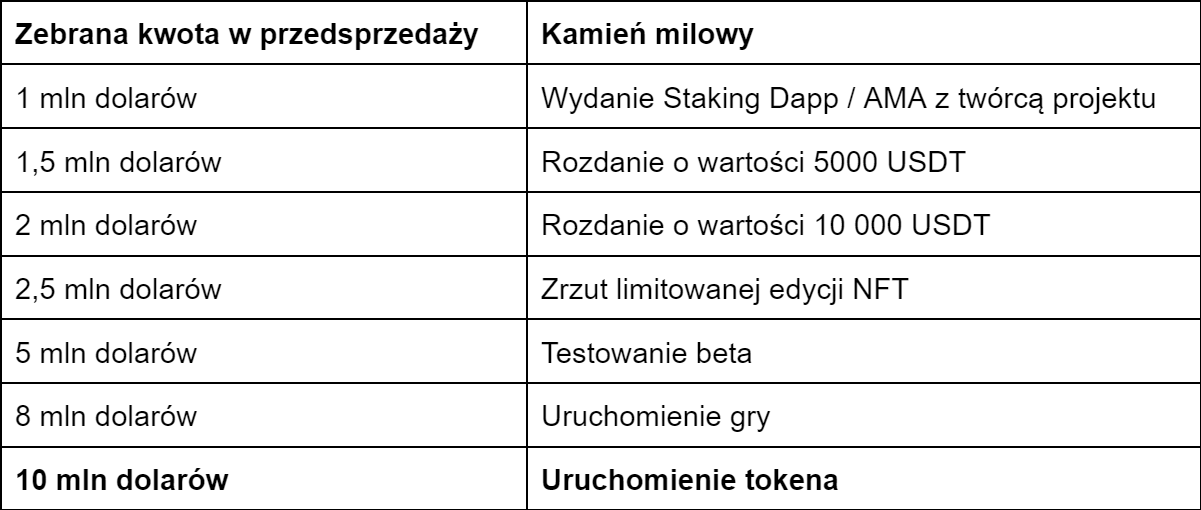 Meme Kombat ze szczegółami zaplanował cały proces przedsprzedaży, wyznaczając kamienie milowe oraz konkretne kwoty, jakie planuje się do zebrania w presale. Najważniejsze z nich z hard capem wynoszącym 10 mln USD przedstawia poniższa tabela.