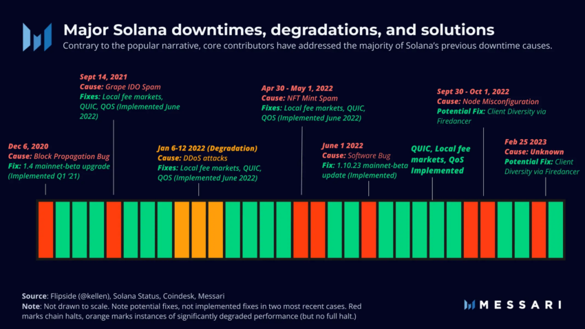 W raporcie Messari z 2023 roku podkreślono niektóre z najgorszych przestojów Solany i czas potrzebny na ich naprawienie.