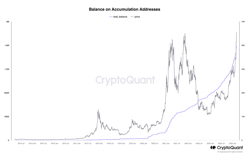 “Całkowite zasoby Bitcoina w adresach akumulacyjnych również osiągnęły rekordowe poziomy. Łączny stan posiadania na tych adresach wynosi obecnie 1,5 mln BTC. Adresy te oznaczają inwestorów, którzy tylko gromadzą Bitcoiny i nigdy ich nie sprzedają, więc przyspieszający wzrost ich zasobów Bitcoinów jest oznaką silnego popytu.”